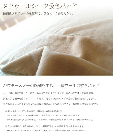 商品詳細 ヌクゥールシーツ敷きパッド(冬のあたたかいウールシーツ) セミダブルサイズ(125×205cm) 縮みを防ぐ加工をした上質のメリノウールシーツです。