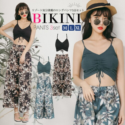 水着 レディース ビキニ ロングパンツ 3点セット ビスチェ フレア水着 ハイウエスト 通販 ビーチ トレンド セパレート mizugi リゾート ママ 水着 体型カバー リーフ柄 小胸 セクシー パッド付き 2020